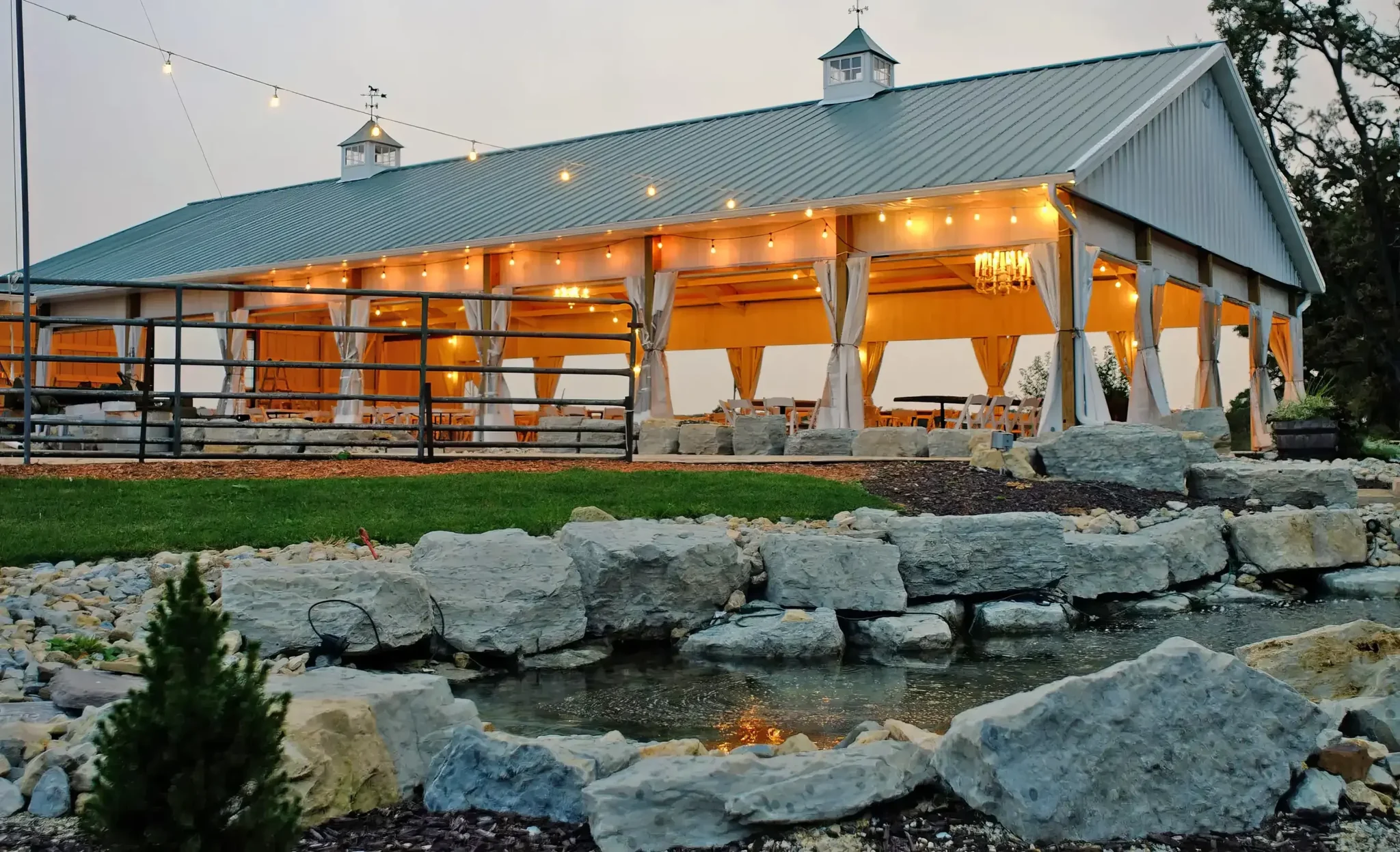 Between the barn and pavilion sits a spacious paver patio—often used for dancing under the sky, DJ setup, or additional lounge seating if the weather allows. It’s a flexible space that brings the evening together and adds an outdoor element to the celebration.